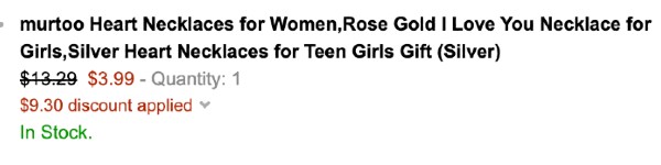 Amazon.com tiene esta Cadena con Pendant de Corazón a solo $3.99 (Reg. 13.29). Aprovecha y pide la tuya antes de que se agoten AQUI. De su precio regular de $13.29 las tienen en oferta y cuando utilizas el código 70JT39KR al momento de hacer el checkout te ahorras $9.30 y terminas pagando solo $3.99. Recuerda que puedes conseguir el envío GRATIS con Amazon Prime o realizando una compra de $25.00 o más. Abajo les dejo el enlace para que prueben Amazon Prime de forma gratuita y sin compromiso. No dejes perder esta super oferta!!! Si te interesa esta oferta la consigues AQUI. Esta oferta es válida mientras duren o hasta las 11:59pm del 01/23/2020. IDEA de REGALO para San Valentin!!!!