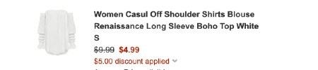 Amazon.com tiene la Camisa Casual Off Shoulder a solo $4.99 (Reg.$9.99). Aprovecha y pide la tuyo antes de que se agoten AQUI. El precio regular es de $9.99, pero al usar el código ZR2SAJJS al momento de hacer el checkout, terminas pagando solo $4.99!!! El envío no esta incluído, pero recuerda que puedes obtener el envío GRATIS con Amazon Prime o realizando una compra de $25.00 o más. Si deseas probar Amazon Prime de forma gratuita y sin compromiso suscríbete AQUI. Si te interesa esta oferta la consigues AQUI. Esta oferta es válida mientras duren!! Solo aplica al tamaño small, los demás tamaños varian en precios.