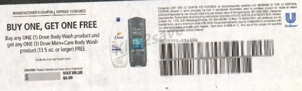 - Usa (1) Buy One Get One Free Dove Body Wash (cupón de la insert SAVE 10/16, exp10/29) – hasta $6.99