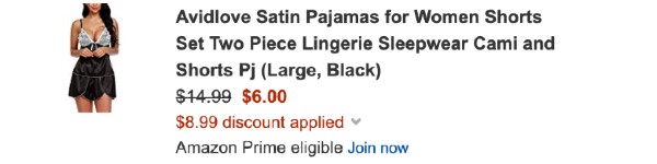 Amazon.com tiene una oferta en este Set de Pajama en Satin Avidlove a solo $6 ($14.99). Aprovecha y pide la tuya antes de que se agoten AQUI. El precio regular es de $14.99 y al utilizar el código WYHDE9XG te ahorras $8.99 por lo que terminas pagando solo $6.00 !!!! El envío no está incluido, pero recuerda que puedes conseguir el envío gratis con Amazon Prime o realizando una compra de $25.00 o más. Abajo te dejo el enlace por si deseas intentar probar Amazon Prime de forma gratuita. No dejes perder esta super oferta!!! Si te interesa esta oferta la consigues AQUI. Esta oferta es válida mientras duren!!
