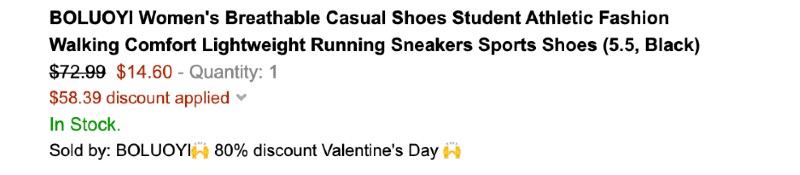 Amazon.com tiene una oferta en los Tenis de Mujer BOLUOYI a solo $14.60 (Reg. $73). Aprovecha y pide los tuyos antes de que se agoten AQUI. El precio regular es de $72.99 y al utilizar el código 803V61AE te ahorras $58.39 por lo que terminas pagando $14.60. El envío no esta incluido. Recuerda que puedes consigues el envío gratis con Amazon Prime o realizando una compra de $25.00 o más. No dejes perder esta super oferta!!! Si te interesa esta oferta la consigues AQUI. Esta oferta es válida mientras duren o hasta las 11:59 pm del 02/06/2020.