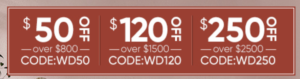 Usa los códigos WD50 en compras de $800 o mas , WD120 en compras de $1,500 y WD250 en compras mayores de $2,500.